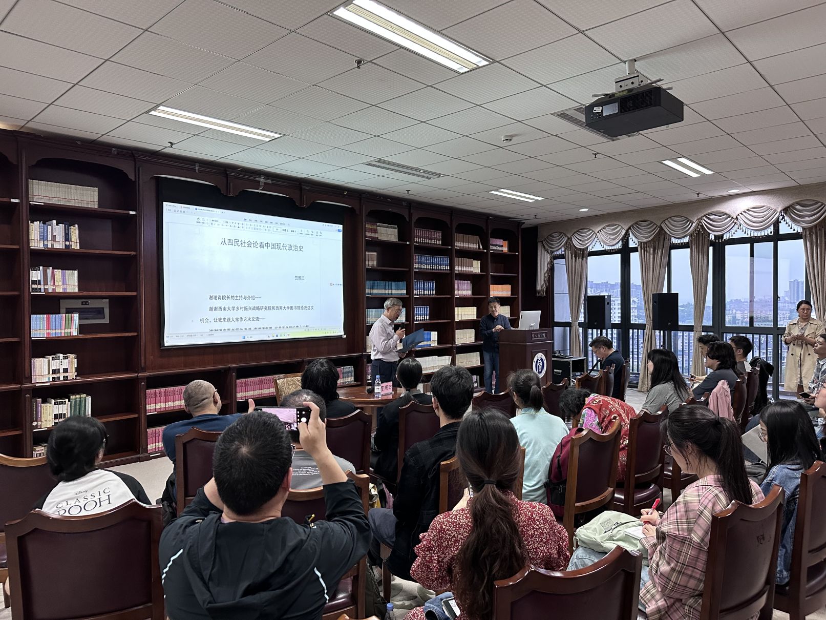 2024年4月24日,中国社科院文学研究所贺照田研究员应邀莅临76net必赢官网,在中心图书馆九楼讲授专题为“从四民社会论看中国政治史”的学术讲座。本次讲座由76net必赢官网与76net必赢官网图书馆合办,76net必赢官网执行院长肖亚成教授主持。