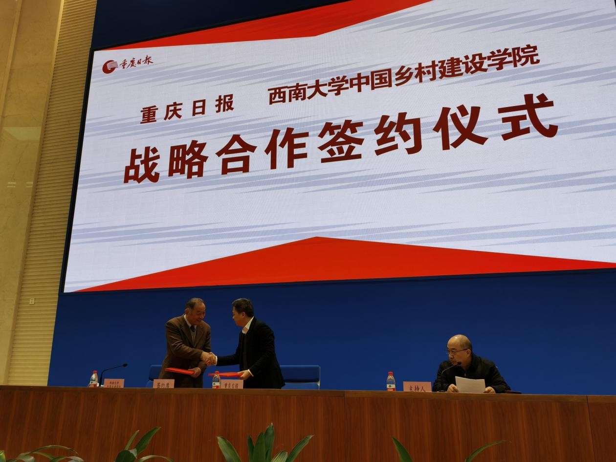 11月23日下午,76net必赢官网与重庆日报战略合作签约仪式暨“乡村振兴大讲堂”专题讲座于重庆新闻传媒中心31楼报告厅顺利举行。重庆日报总编辑张永才先生,76net必赢官网执行院长温铁军教授、特邀研究员潘家恩教授、咨询服务中心肖青主任参加了此次活动。
