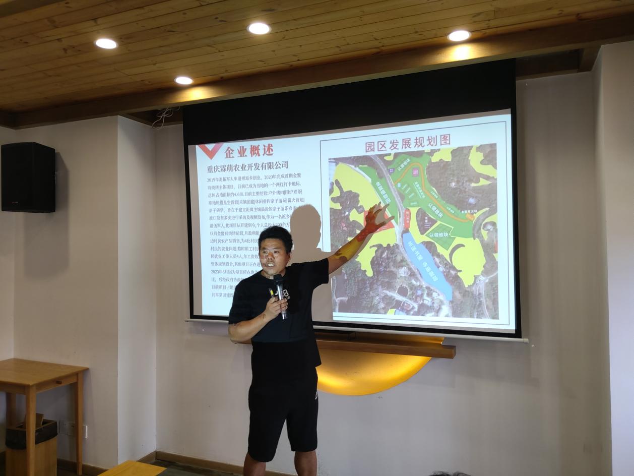 本次总结会邀请了重庆霖萌农业开发有限公司负责人牟道彬,他以《心无向往,唯见彩虹——霖萌彩虹亲子农庄成长记》为题,讲述了返乡创业的动机、规划、困难,以及创业的需求和困惑,并与参会人员就其目前所做的乡村养老项目的发展现状进行了探讨和交流。