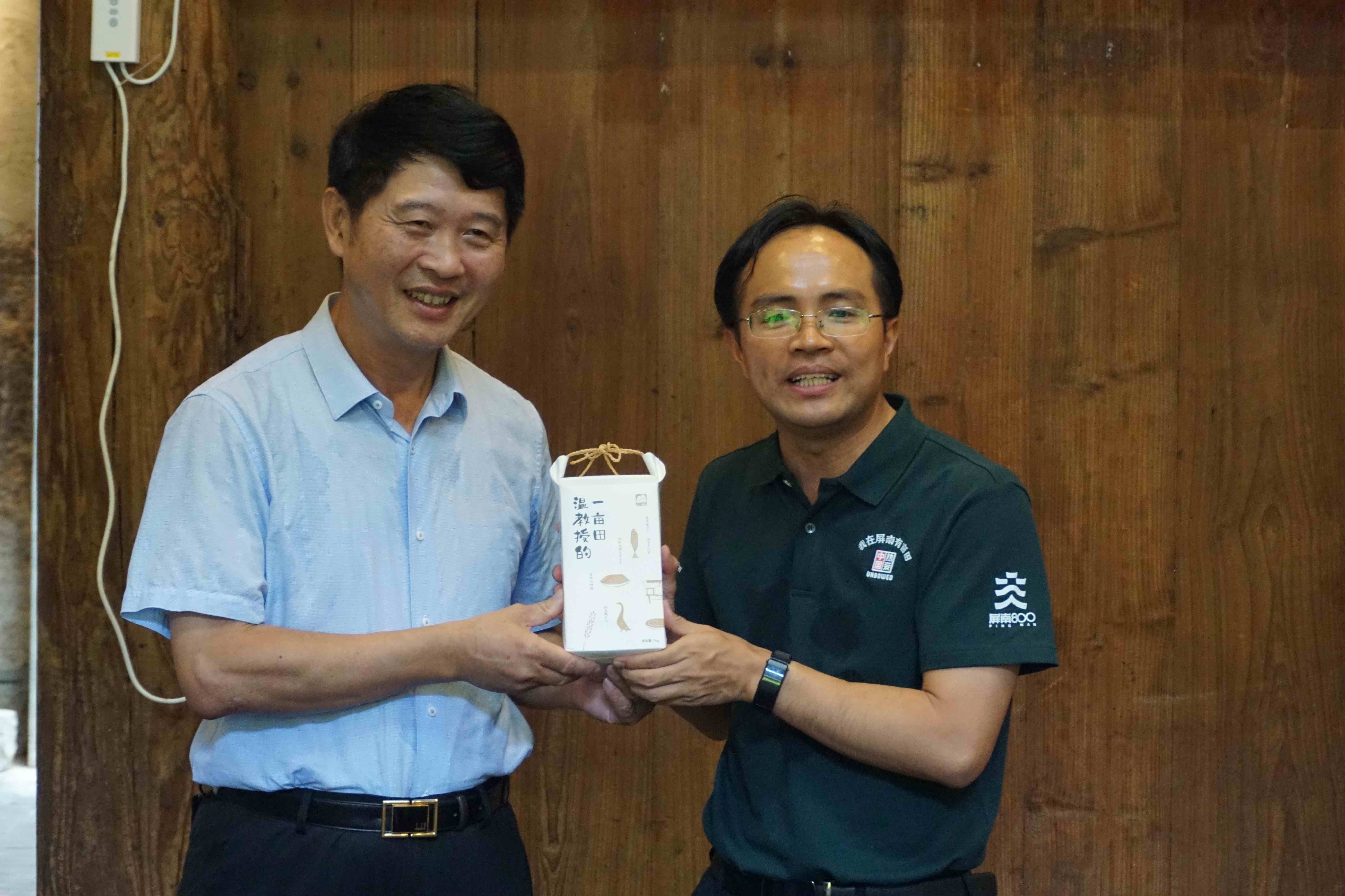 仪式上,刘宏伟主任寄语“乡建乡创天地间 用心研习促融合”,希望未来有更多的专家学者与青年学子扎根乡村,在田间沃土的滋养中促进乡村人才振兴。张德力主席介绍了屏南县通过长期的探索与实践形成的“党委政府+能人+古村+村民+互联网”的发展模式。随后,刘宏伟主任向研究院赠书,潘家恩教授回赠“温教授的一亩田”生态大米表示感谢。