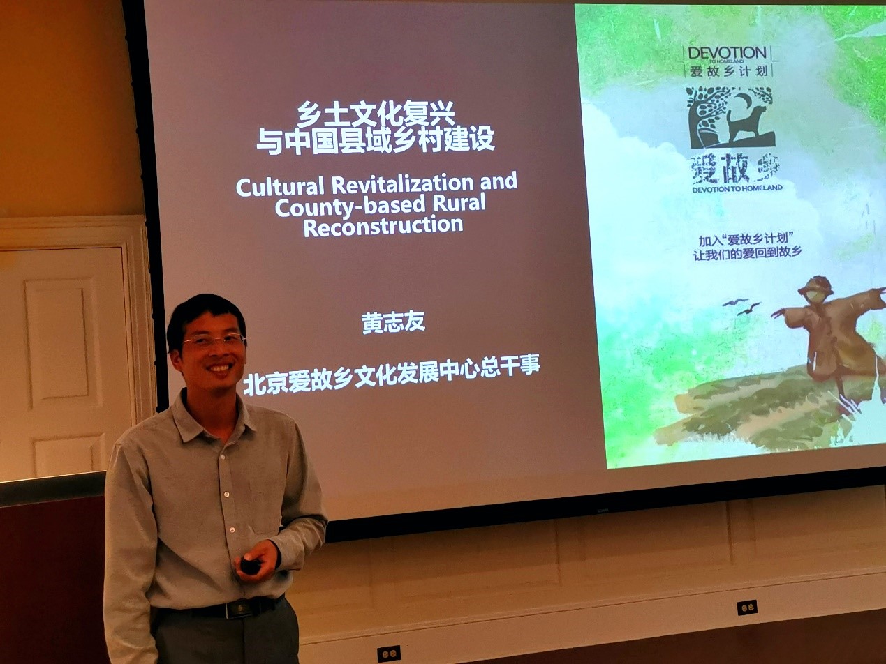 第三个议题是“爱故乡”。在霍普金斯大学所在的巴尔的摩市,更多是从平民窟打拼出来的教授们做了回馈社区的工作,包括以音乐、电影等艺术方式服务社区,针对居无定所的一些贫困人口支付的起的住房项目等。北京爱故乡文化发展中心总干事黄志友从挖掘地域文化(包括发现故乡之美、村歌计划、乡土书写等方式)、发挥新乡贤力量、搭建爱故乡城乡公益服务平台等方面,展示了中国爱故乡行动与县域乡村建设的做法与成效。