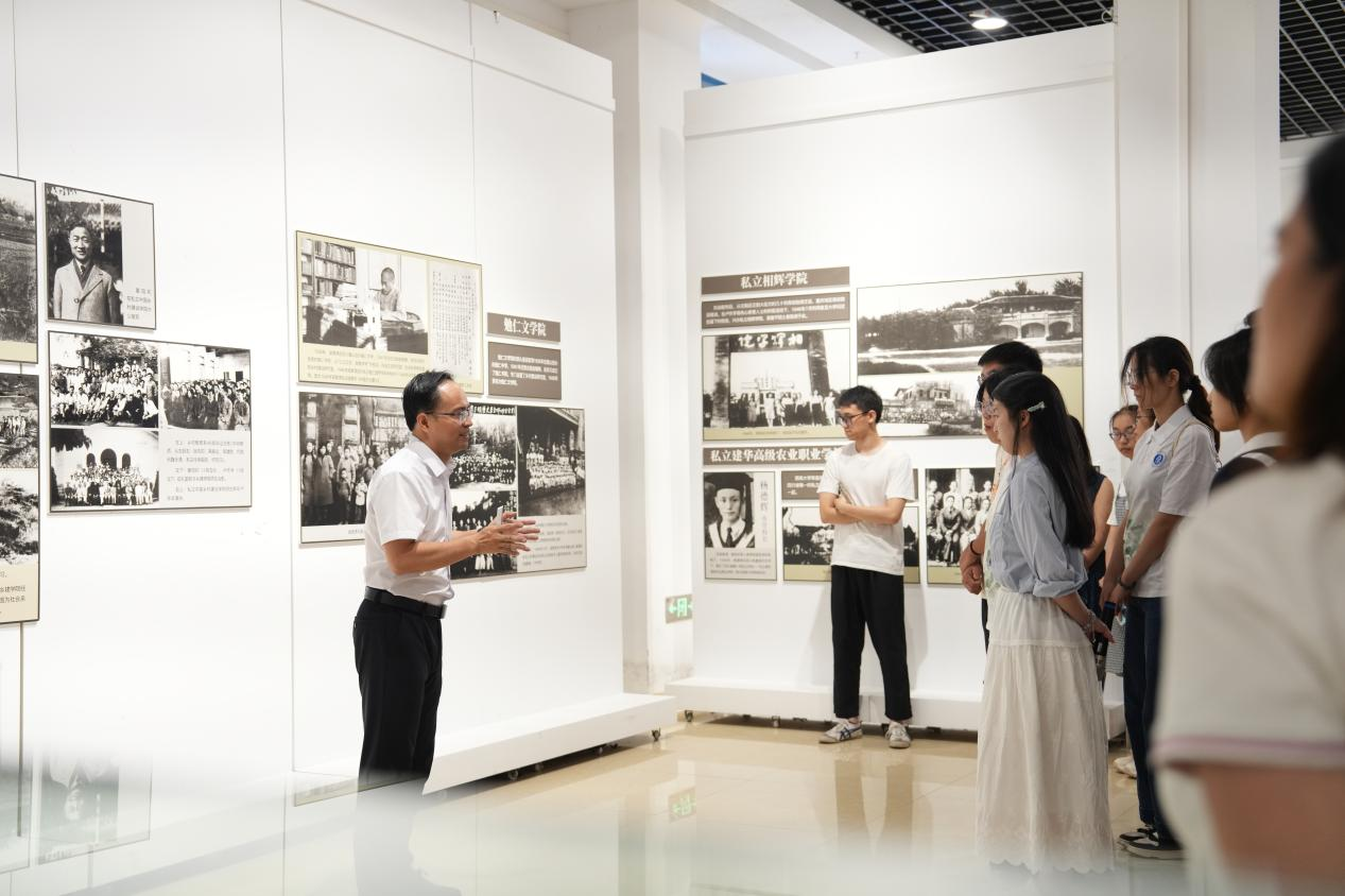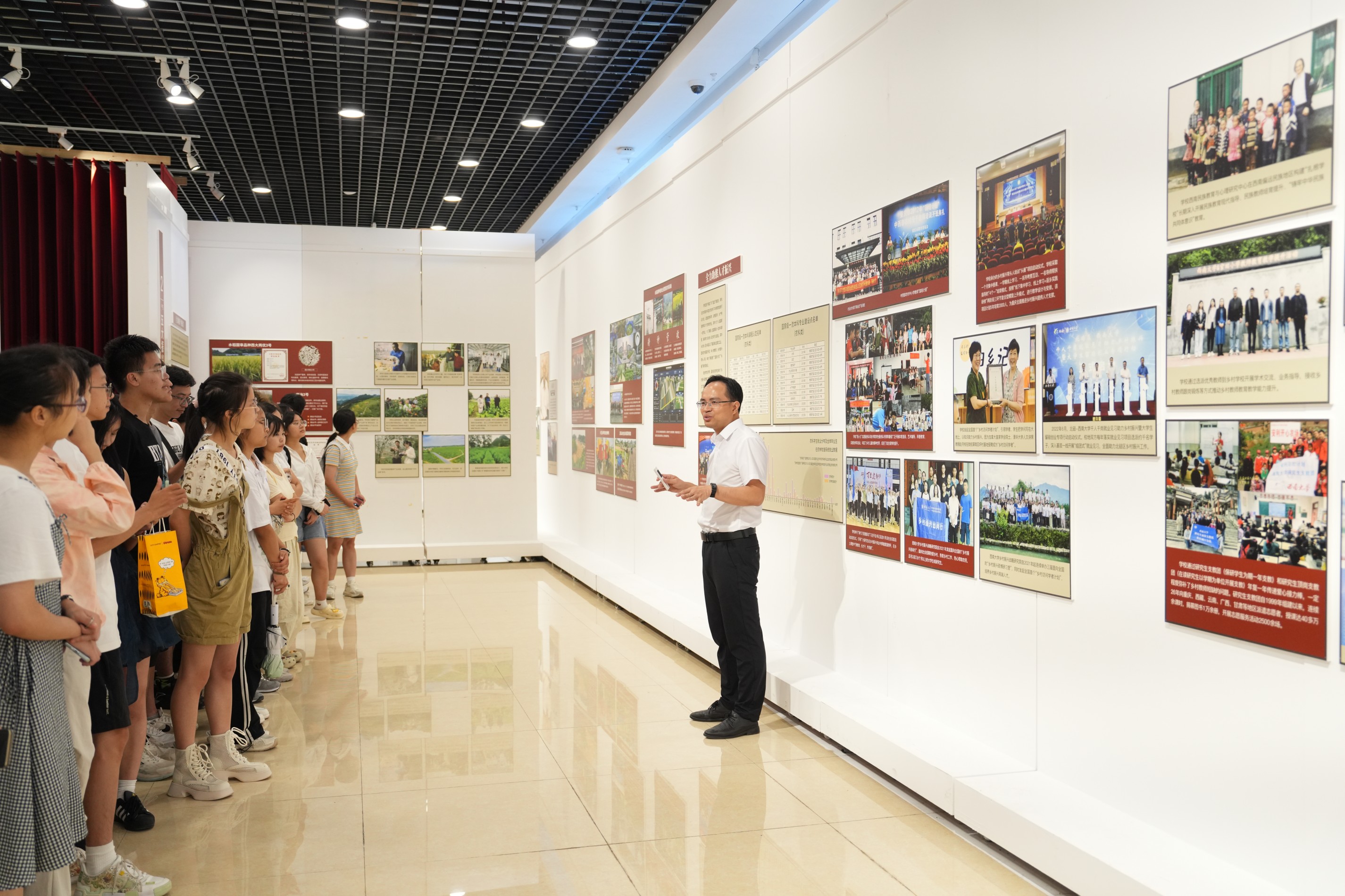 在76net必赢官网强农兴农百年成就展展厅,潘家恩教授通过丰富的图文陈列与实物展品,生动讲述了中国乡村建设的百年历史以及76net必赢官网在强农兴农征程上的重要探索。他结合自己二十多年的乡村建设实践经验,从“百年乡村建设中的西大身影”“全面乡村振兴中的西大作为”和“农业强国建设中的西大担当”三个方面,深入浅出地阐述了乡村建设的多元化试验、人才培养的探索经验,以及高校师生如何参与乡村振兴等重要内容。
