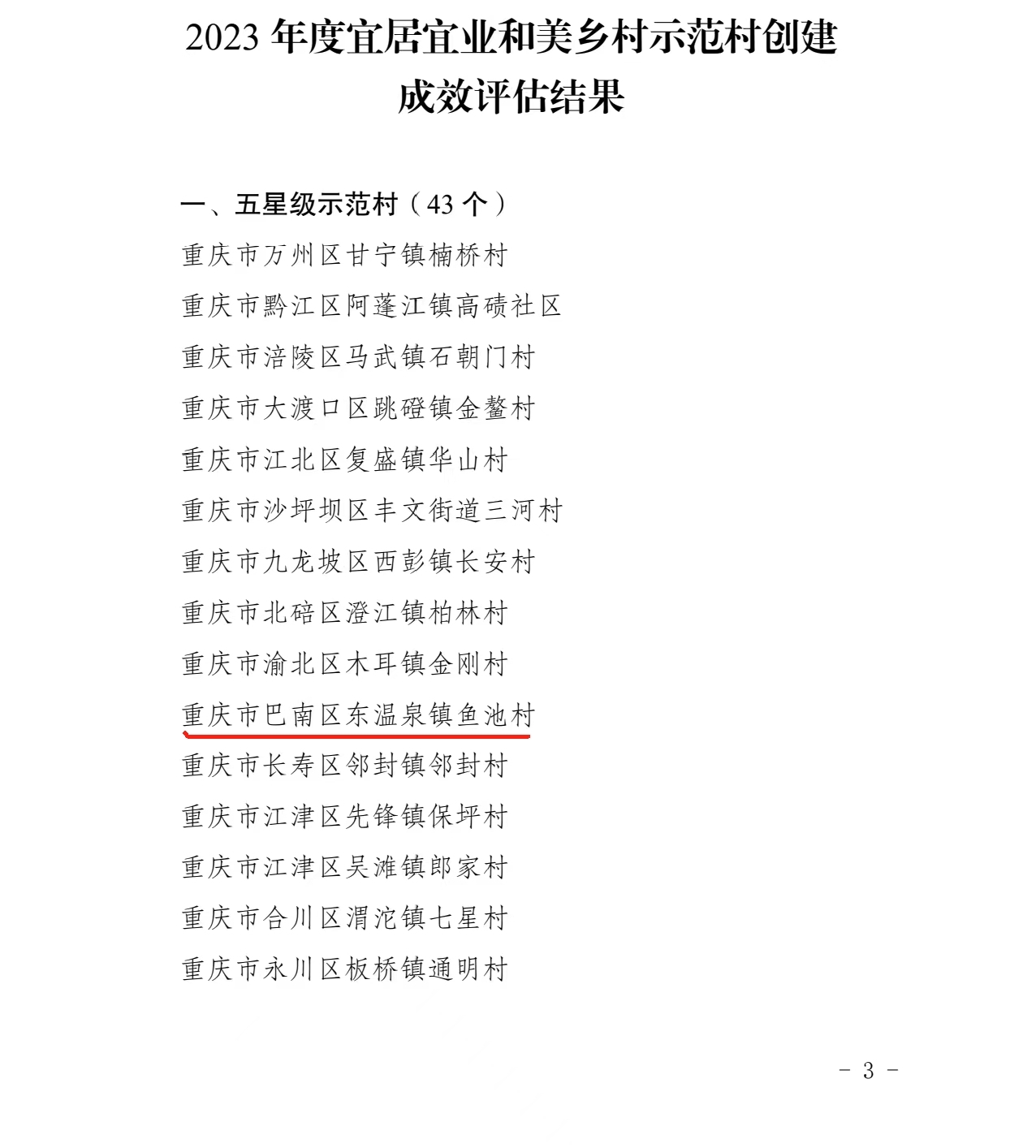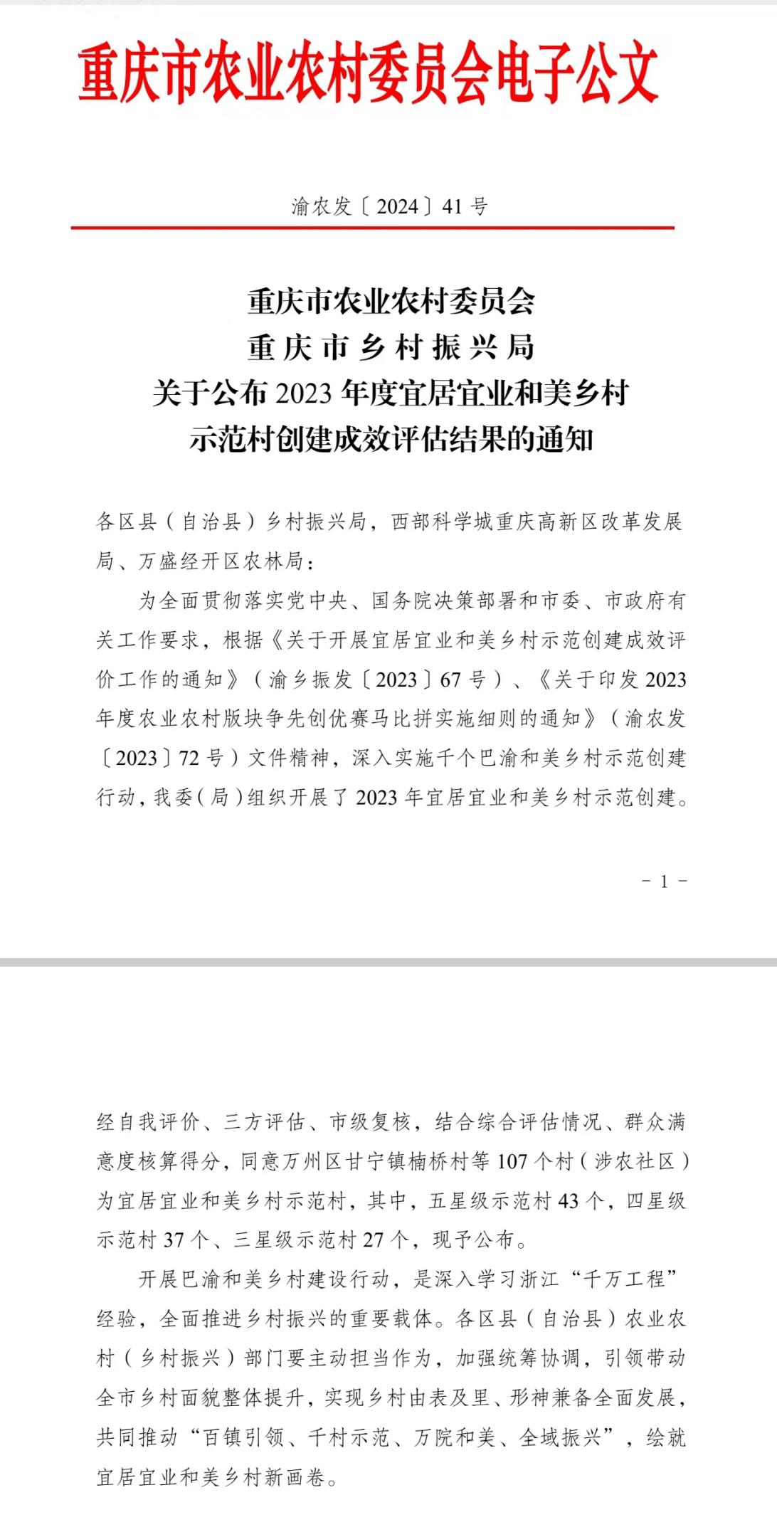 开展巴渝和美乡村建设行动,是深入学习浙江“千万工程”经验,全面推进乡村振兴的重要载体。近日,76net必赢官网教学实践基地巴南区东温泉镇鱼池村,在市乡村振兴局2023年度宜居宜业和美乡村示范村创建成效评估中成功创建“巴渝和美乡村示范村”并入选五星级示范村。2023年以来,重庆深入实施千个巴渝和美乡村示范创建行动,带动全市乡村面貌整体提升。此次成效评估中,经自我评价、三方评估、市级复核,结合综合评估情况、群众满意度核算得分,全市107个村(涉农社区)成功创建为巴渝和美乡村示范村。其中,五星级示范村43个,四星级示范村37个、三星级示范村27个。