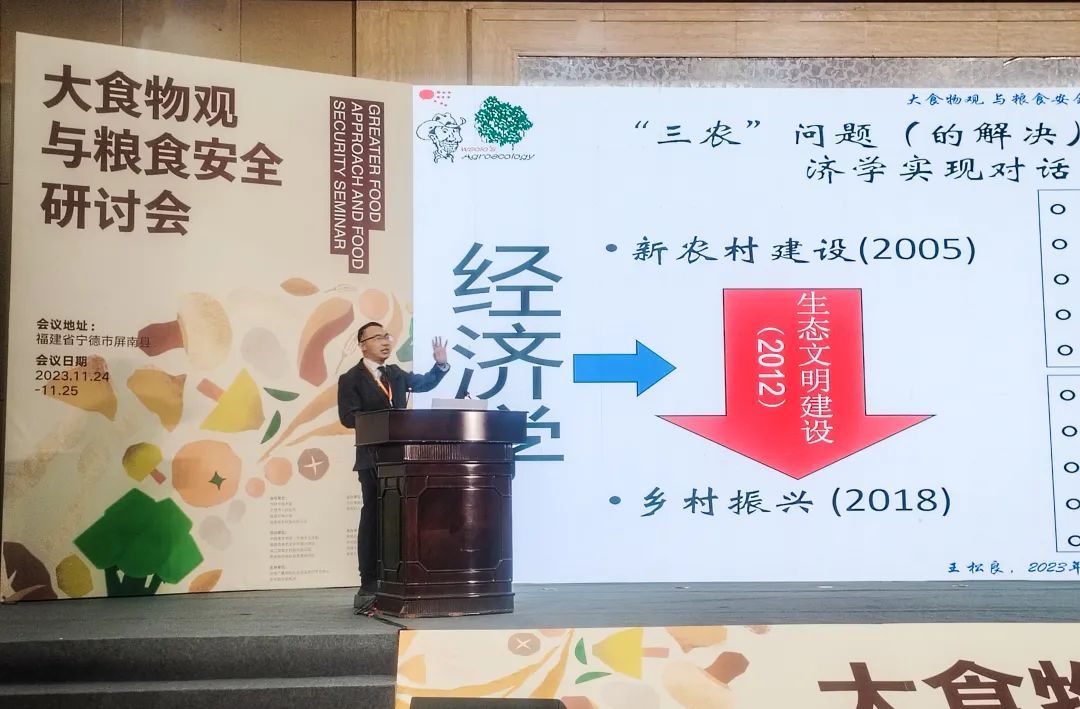 福建农林大学农学院教授、屏南乡村振兴研究院生态农业与生态文明转型研究中心主任王松良作《粮食安全、大食物观与生态农业》主旨演讲,他强调指出:“农业是把太阳光转变成人们健康、幸福生活的事业。”因此,指导农业发展的学科一定要从经济学走向生态经济学;发展生态农业是实现农业绿色转型和大食物观的根本途径,倡议通过构建健全的农业生态补偿、生态产品认证和社区支持农业机制,推进生态农业产品价值的全面兑现。