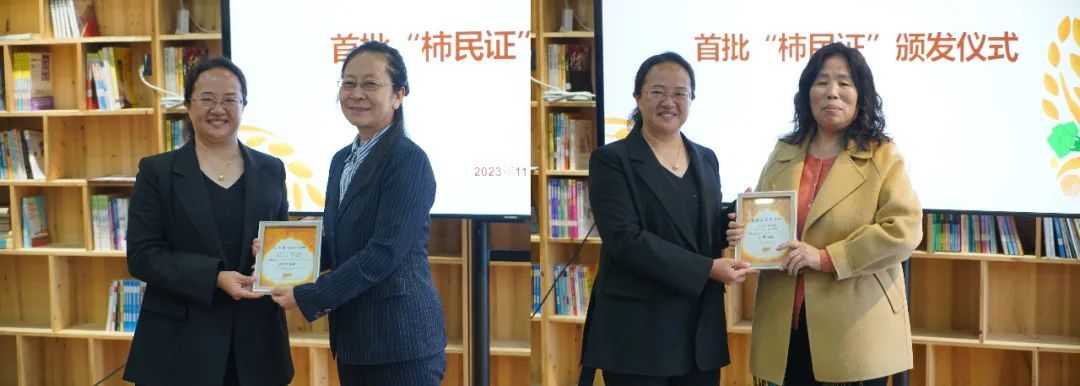 熙岭乡乡长杨林为民盟中央教育委员会秘书长萧淑贞(左),中央新影集团一级导演韩君倩(右)颁发柿民证