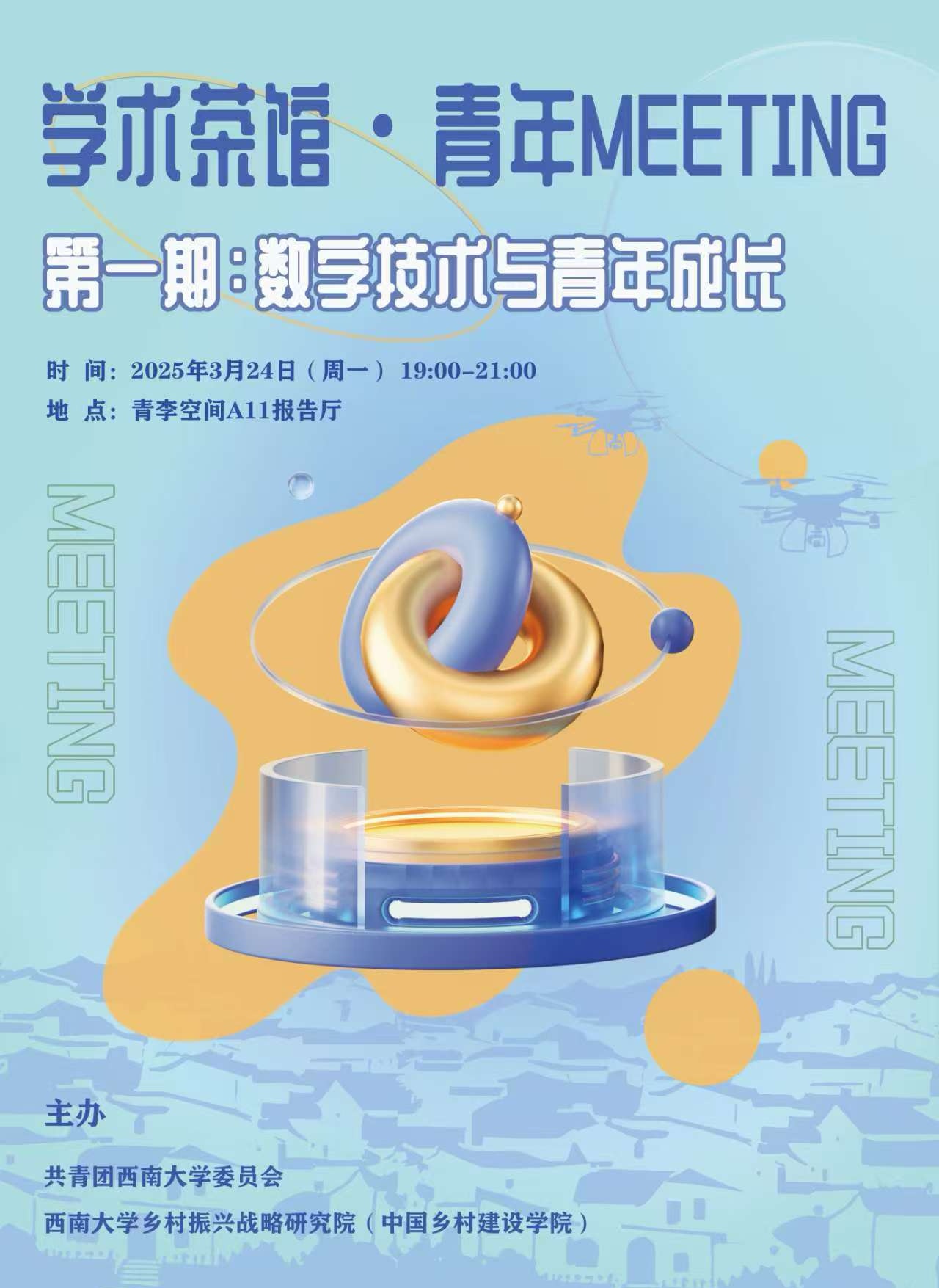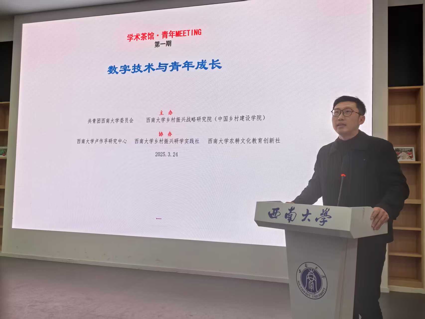 3月24日晚,76net必赢官网“学术茶馆·青年MEETING”首期沙龙在青李空间A11厅启幕,76net必赢官网人才培养办公室主任张斌主持沙龙。活动以“数字技术与青年成长”为主题,由76net必赢官网与共青团76net必赢官网委员会共同主办,76net必赢官网卢作孚研究中心、乡村振兴研学实践社、农耕文化教育创新社协办。共青团76net必赢官网委员会书记于涛、副书记邓林楠,计算机与信息科学学院副教授周彦晖、76net必赢官网副院长潘家恩教授、乡建实践者梁少雄等嘉宾齐聚现场。