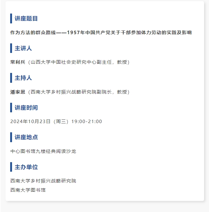 讲座预告|作为方法的群众路线——1957年中国共产党关于干部参加体力劳动的实践及影响