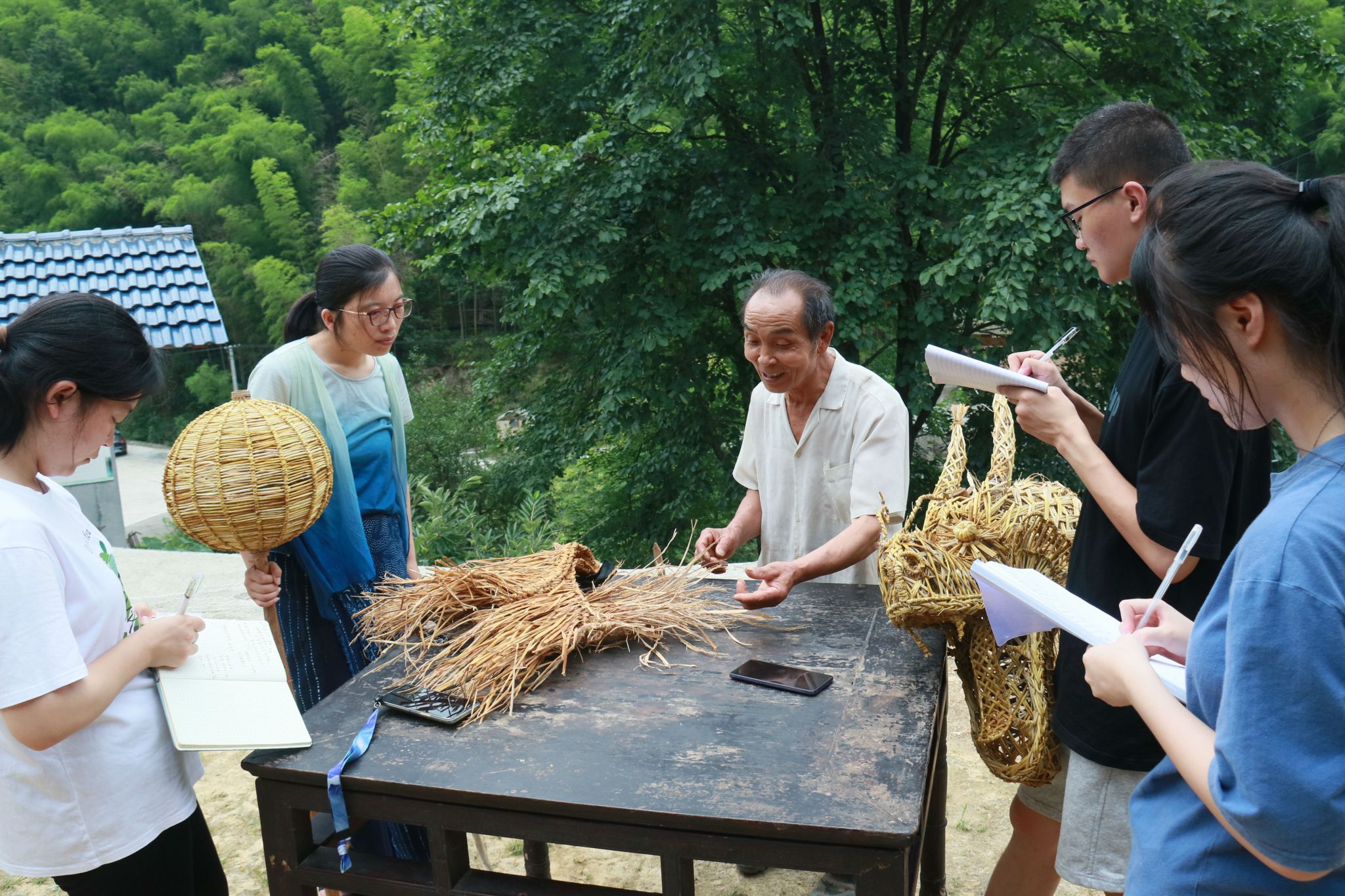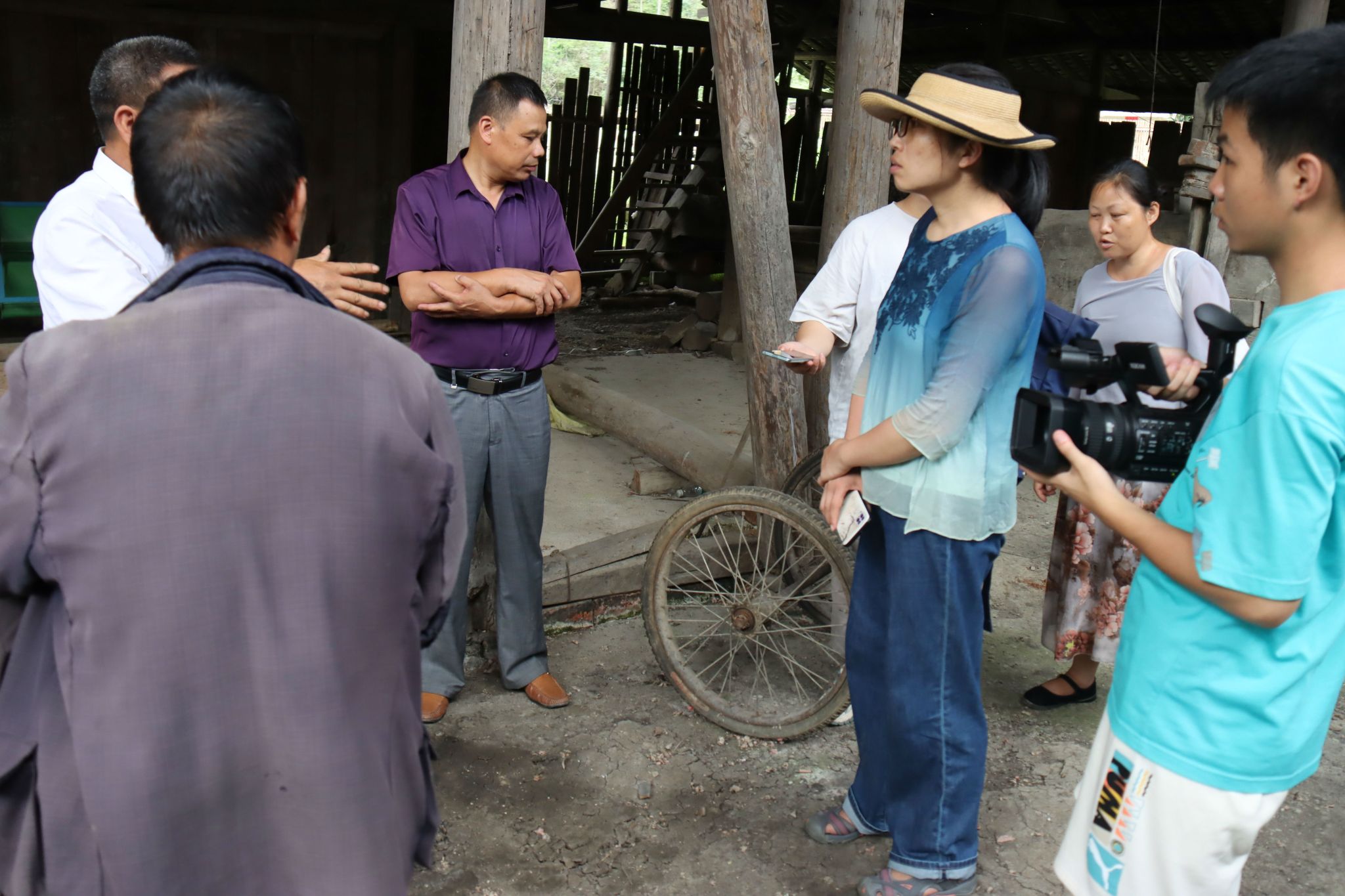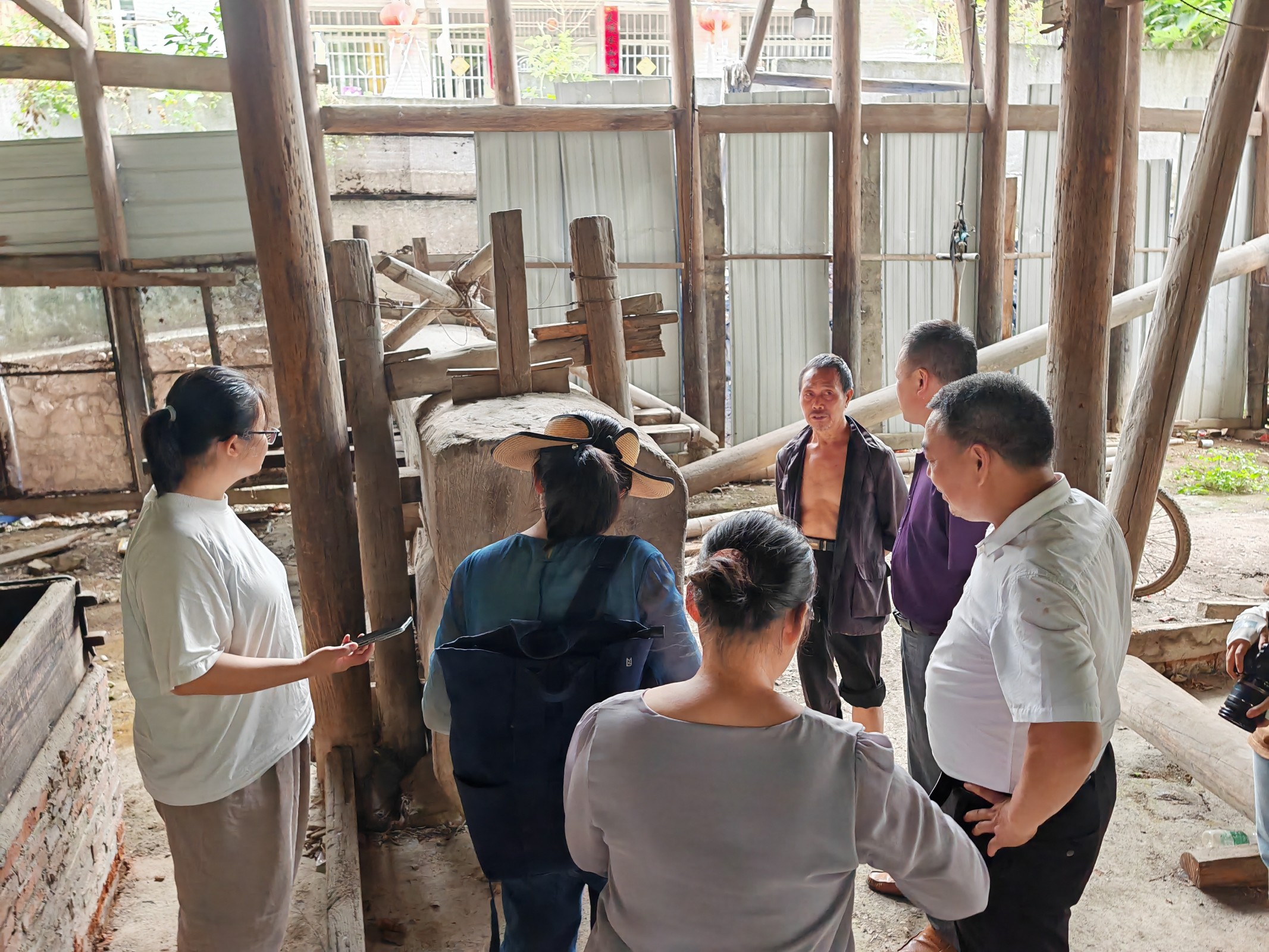 实践团成员在旺田村黄波书记和当地女性创业者“辣椒女侠”张望川的带领下,走访调研市级非遗“草龙舞”和青朗乡佘家古法榨油作坊等乡土文化。草龙舞调研小组前往彩云谷拜访“草龙舞”第六代传承人张绪庭和第七代传承人梁美云,对草龙舞的历史演变、结构特征、编制技艺、传承机制、表演体系等做了系统调查。调研师生身穿草衣草裙、头戴草帽、手持草龙,参与体验龙舞魅力,并思考民间手艺传承困境的破局之道。古法榨油调研小组去往青朗乡佘家古法榨油作坊考察拍摄古法榨油的工序过程,将古法榨油传承者的口述与实地考察结合起来,记录即将消失的老手艺及其历史故事。