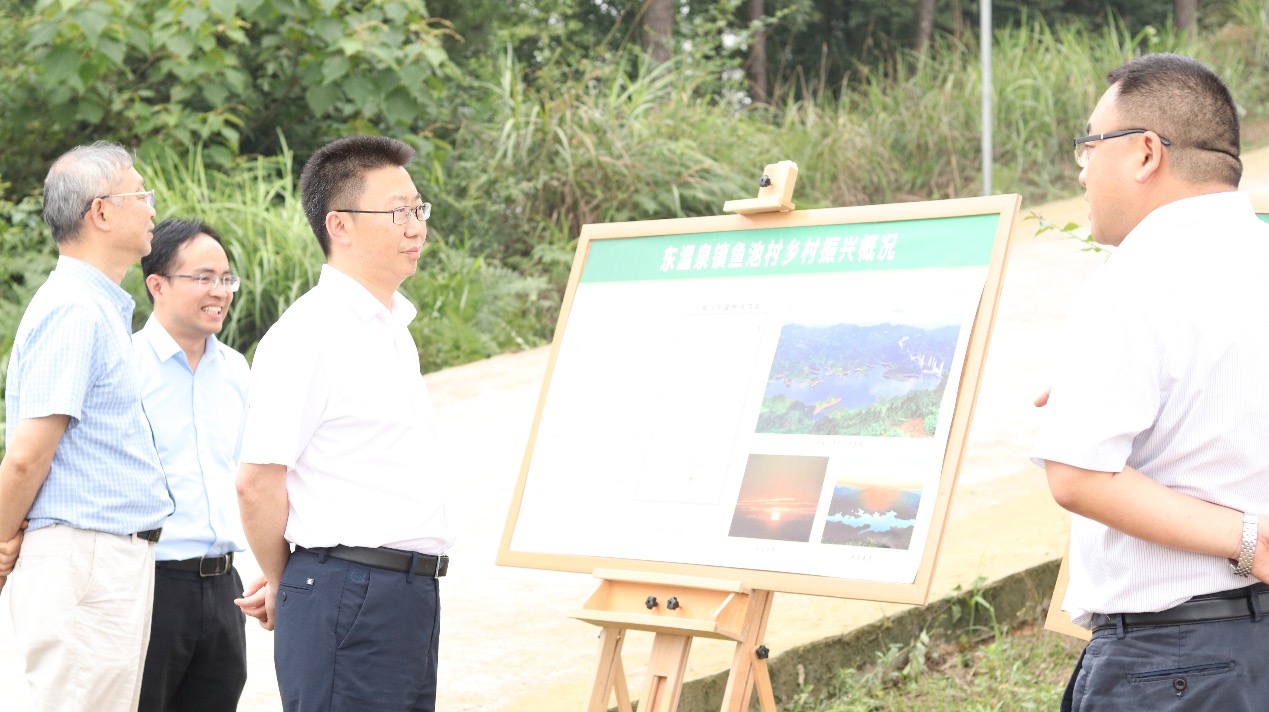 王仕杰副局长首先来到鱼池村大巷观景台,现场听取了巴南区东温泉镇党委书记李晓秋针对鱼池村党建引领、群众路线、产业融合、未来规划的工作情况汇报。