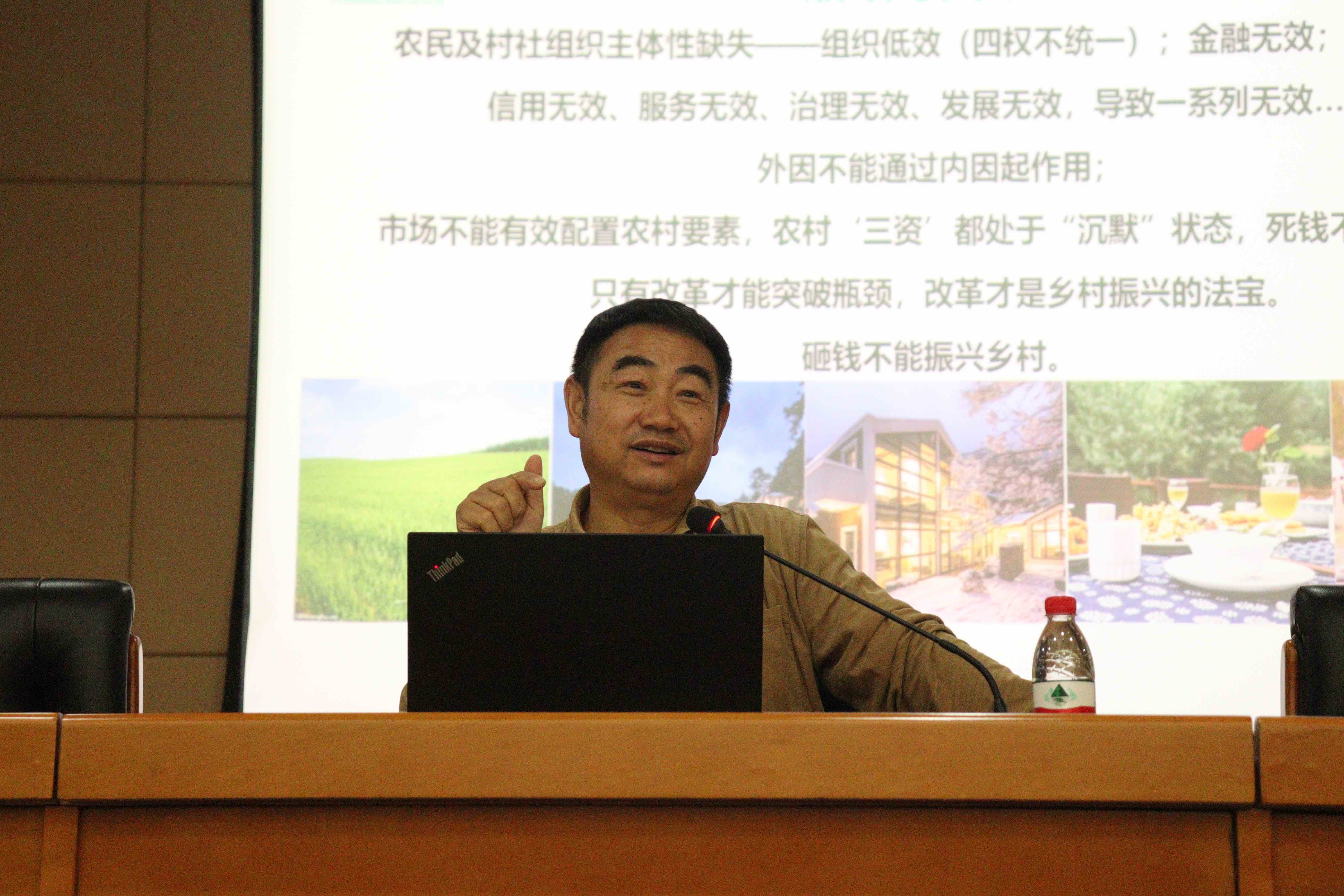 他首先指出,乡村振兴的背景是五大拐点,包括中美关系拐点、一般性制造业中国拐点、城乡比较优势拐点、城乡资产价格比价拐点和价值观拐点。在此背景下,他认为中国处于内循环与外循环并存、城市化与逆城市化并存的局面,需要产业生态化、生态产业化和生态价值市场化,激活乡村沉默资源资产、推动乡村振兴大有可为,因此他于2011年创立了中国乡建院。在国家乡村振兴目标20字方针(产业兴旺、生态宜居、乡风文明、治理有效、生活富裕)的指导下,乡建院确立了实现农民五大收入突破(生产性收入、经营性收入、劳务性收入、财产性收入、政策性收入)和死资源变活资本突破的目标任务。