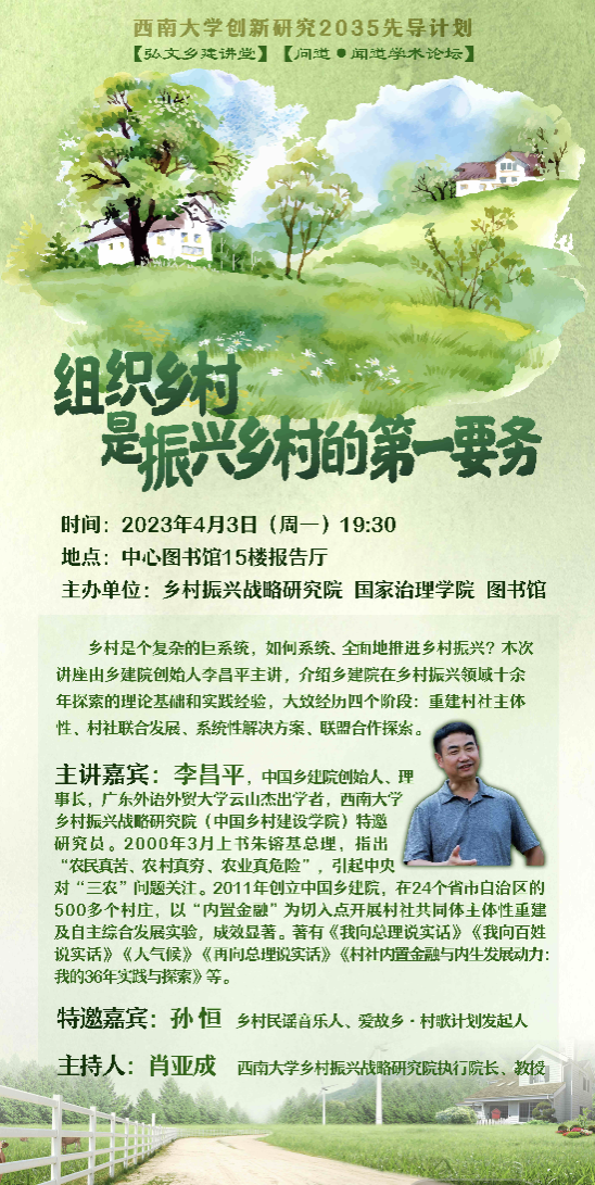 4月3日晚,76net必赢官网弘文乡建讲堂第53讲在中心图书馆报告厅举行。讲座主题为“组织乡村是振兴乡村的第一要务”,由中国乡建院创始人李昌平主讲。76net必赢官网执行院长肖亚成主持。此次讲座由76net必赢官网与国家治理学院、图书馆共同主办。此次讲座亦为学校创新研究2035先导计划“乡村振兴的中国道路”学术活动。
