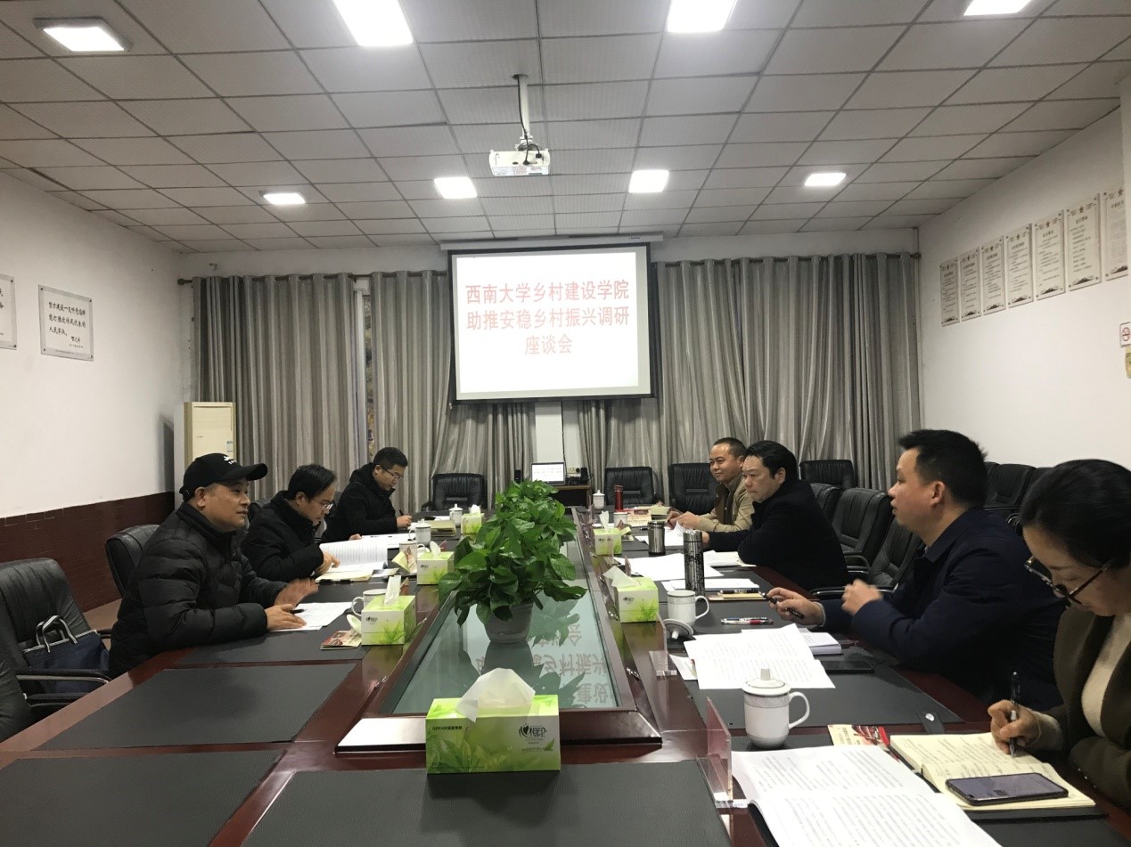 2021年11月23日,76net必赢官网中国乡村建设学院执行副院长潘家恩、地方合作中心主任肖青、培训中心主任张斌、郭凌燕老师共四人赴重庆市綦江区安稳镇开展乡村振兴调研,活动结束后双方召开座谈会,就安稳镇乡村振兴的现状、未来发展及校地合作等问题进行了沟通交流。