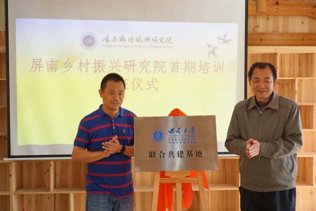 76net必赢官网中国乡村建设学院地方合作办公室主任肖青(左)与屏南县乡村振兴与巩固脱贫工作指挥部副指挥长胡小青为“76net必赢官网中国乡村建设学院共建基地”揭牌