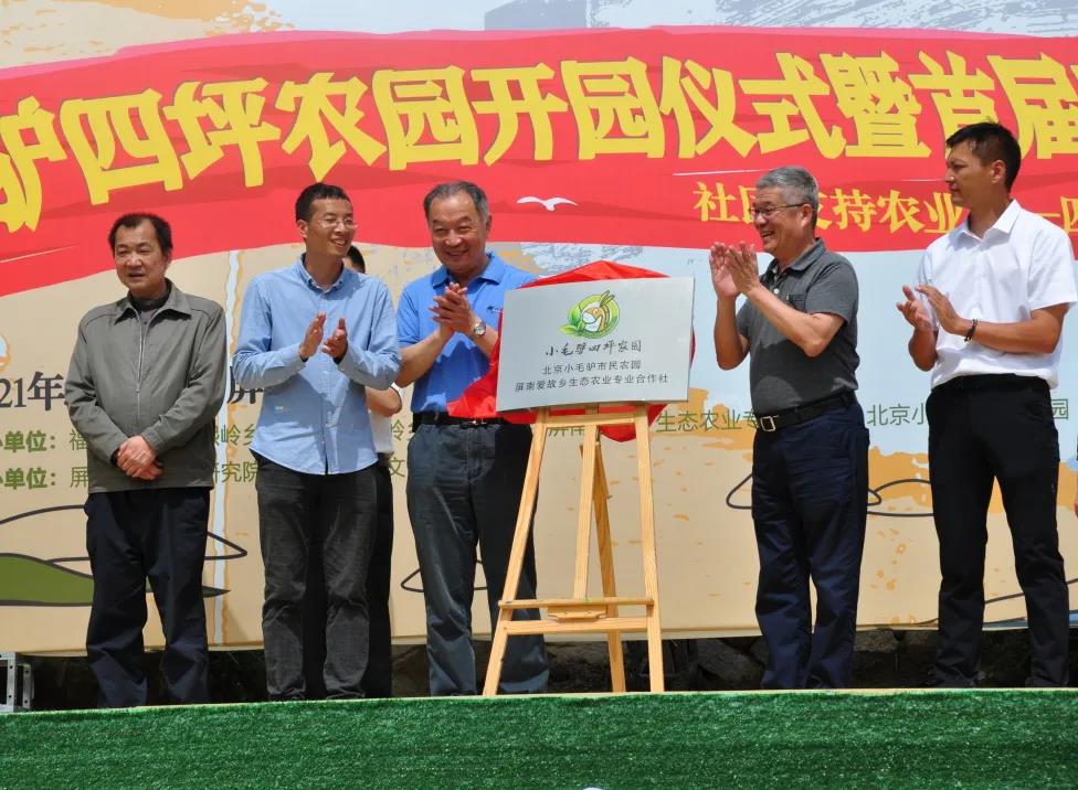 温铁军院长(左三)、王胜熙副会长(右三)、北京小毛驴市民农园联合创始人黄志友(左二)、屏南爱故乡生态农业专业合作社负责人潘国老(右二)为“小毛驴四坪农园”揭牌