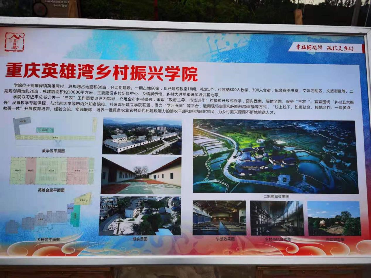 重庆英雄湾乡村振兴学院位于九龙坡区铜罐驿镇英雄湾村,在明诚书院(原巴县一中)旧址上建立,旨在以此为平台,面向室内外涉农干部和新型职业农民开展教训培训、经验交流、实践锻炼等工作。学院占地60亩,已建成教室18间、礼堂1个,可容纳800人教学、300人食宿,配套有图书馆、智村、文体活动区、文旅街区等。