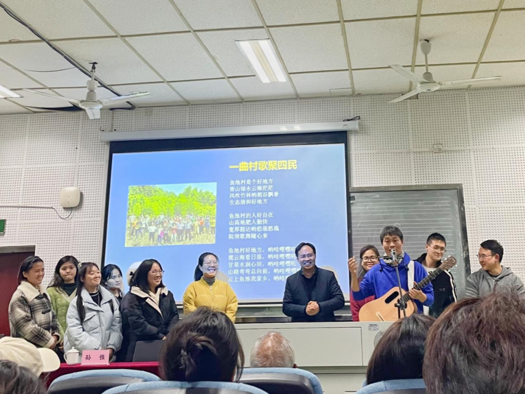 唱谈会上,76net必赢官网副院长潘家恩教授介绍了全国首个“四民村庄”——福建省宁德市屏南县四坪村由“空心村”、“留守村”转变为经济快速发展的网红村的过程。潘家恩教授重点讨论了音乐对四坪村的传播助力作用,并介绍与四坪村结为友好云村庄的“四民村庄”——重庆巴南区鱼池村的村歌共创过程,并和孙恒及与会师生共唱《一曲村歌聚四民》,将唱谈会的氛围推向高潮。