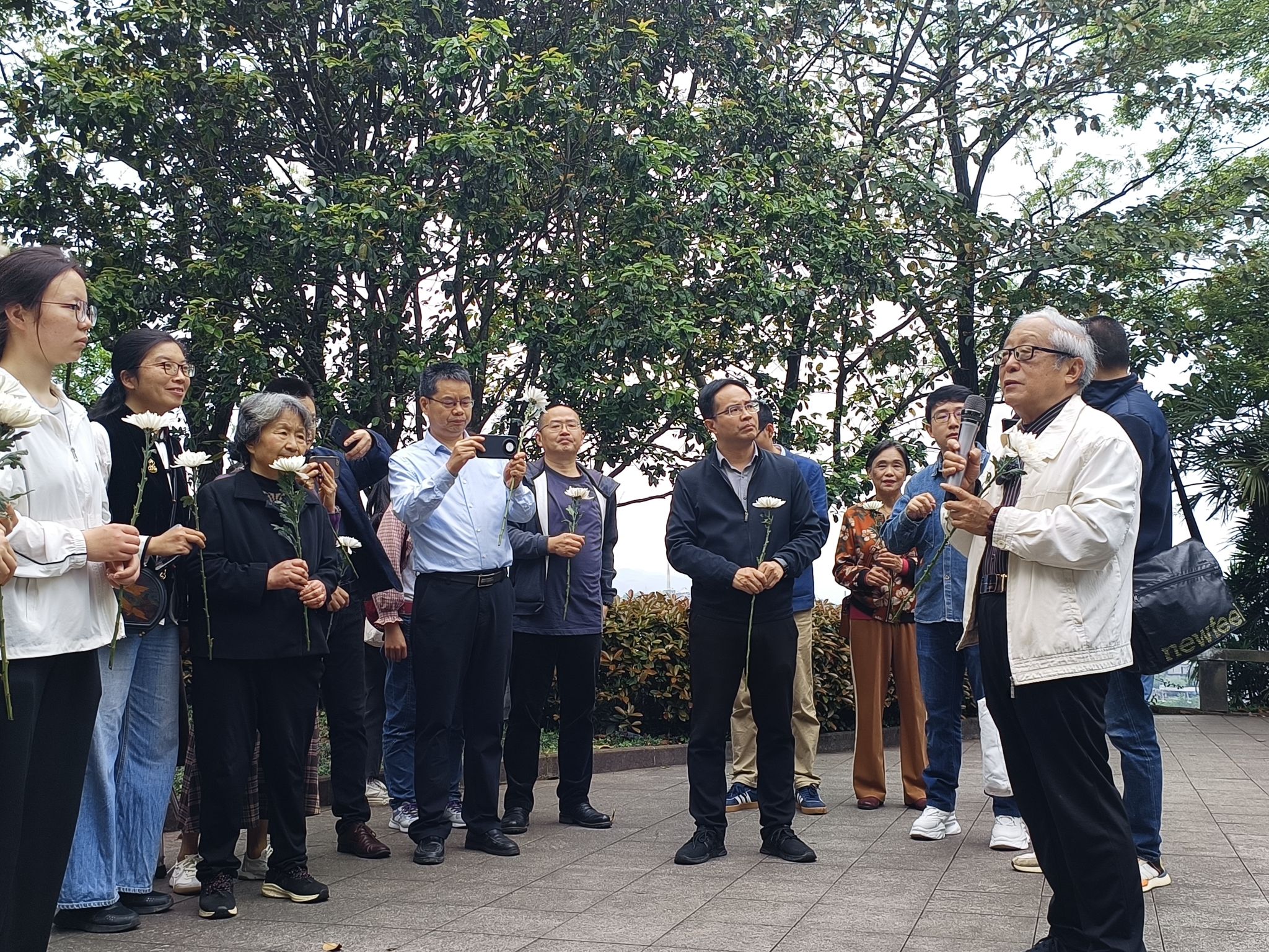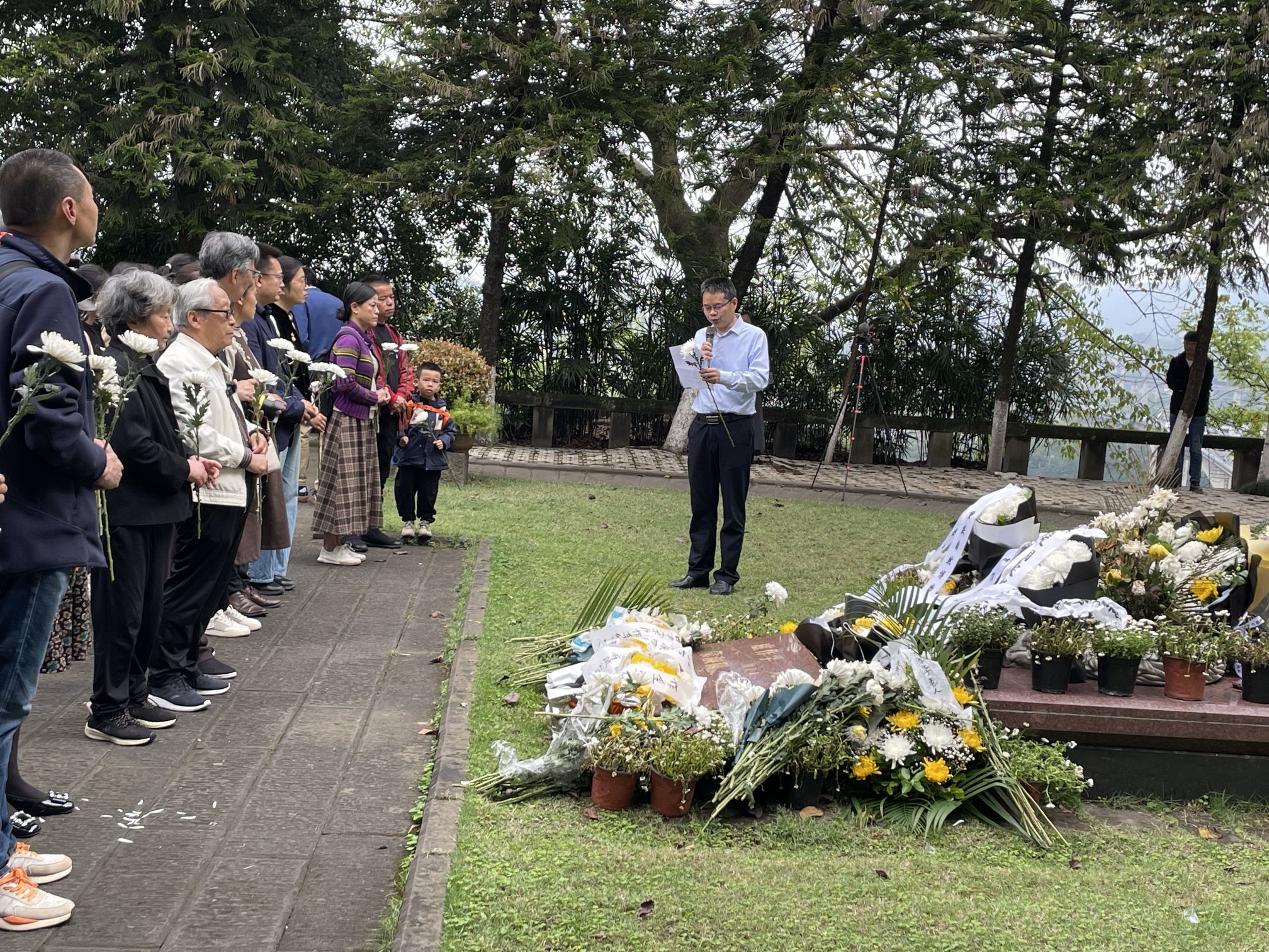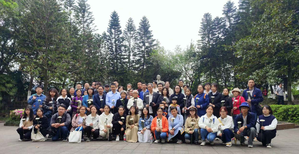 最后,全体人员齐聚卢子英先生墓前敬献鲜花并三鞠躬。潘家恩教授向大家介绍卢子英先生的事迹:“他不仅是卢作孚的胞弟,更是作孚先生的得力助手,为推动北碚各项建设事业的发展作出了重要贡献。”