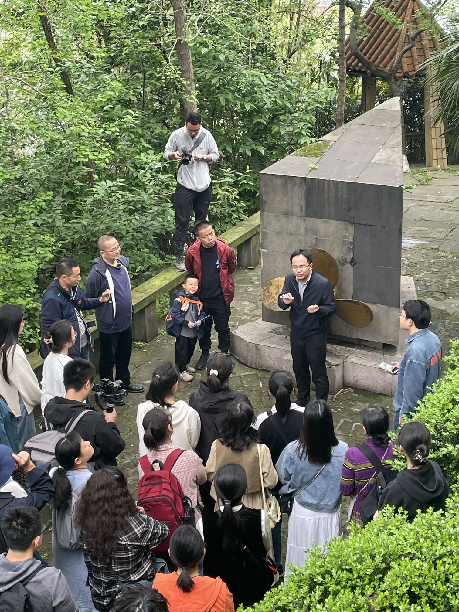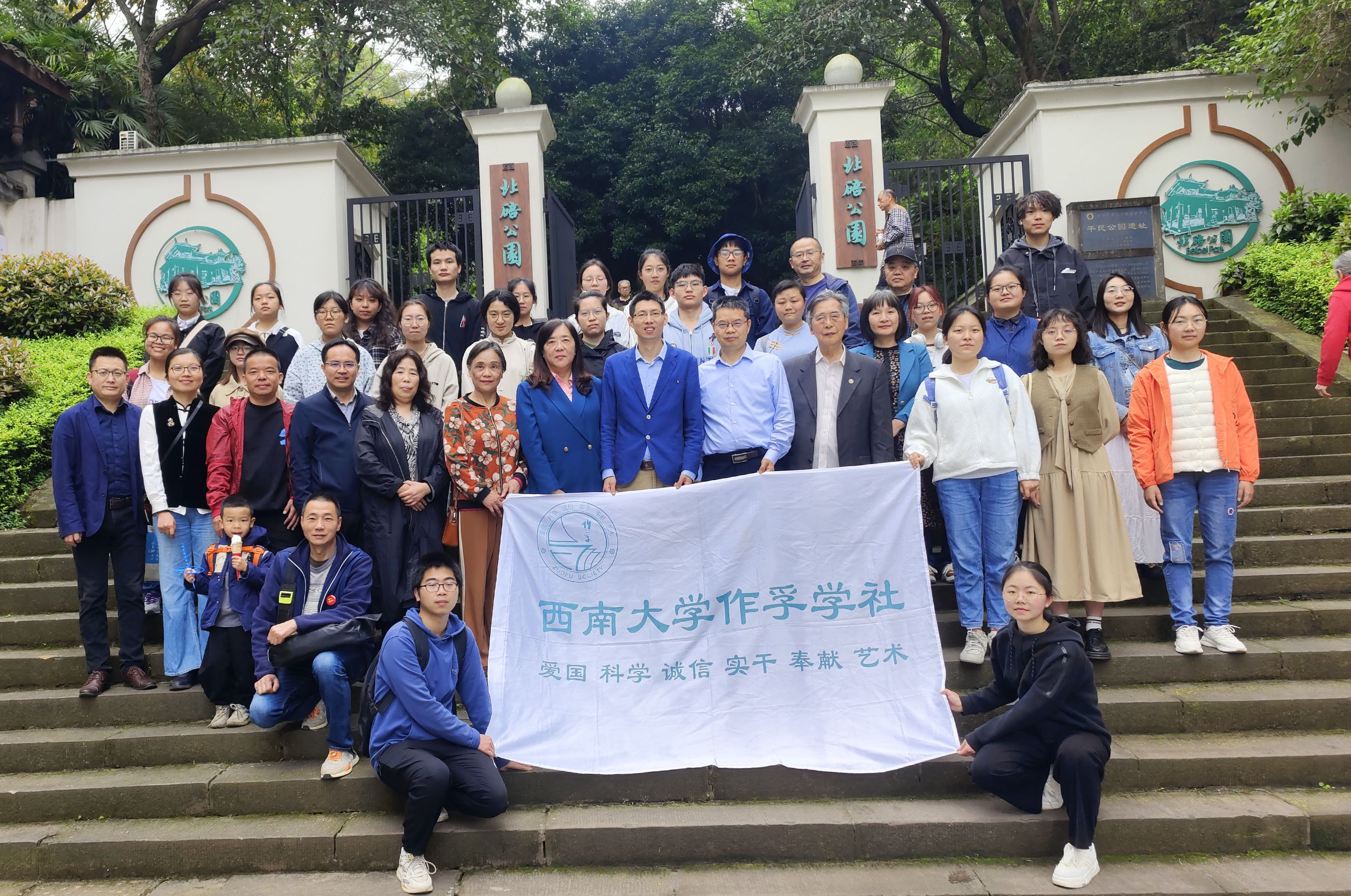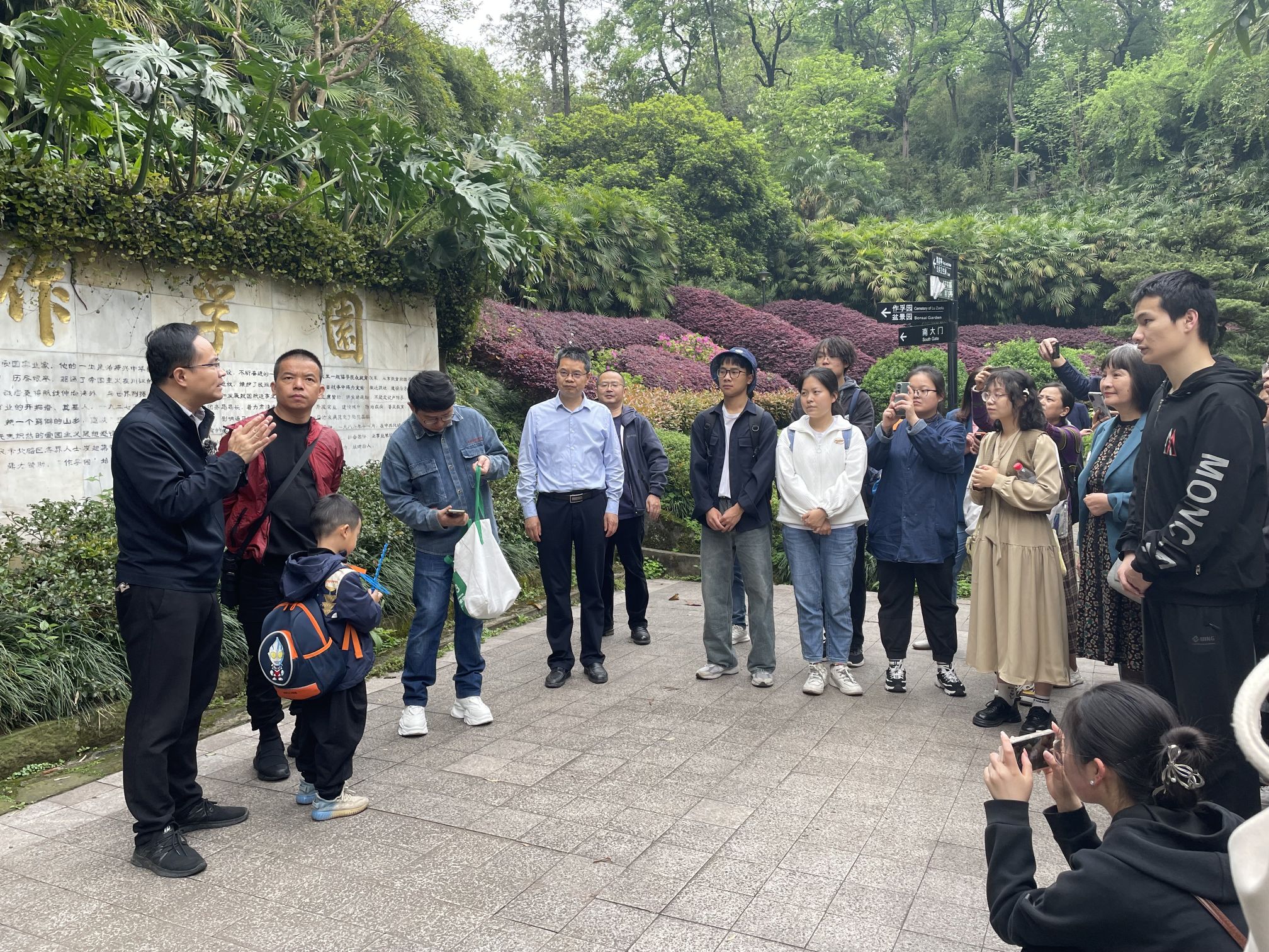 祭扫活动在北碚文史专家李丹老师和潘家恩教授的讲解中开始。北碚公园是近代嘉陵江三峡乡村建设的产物,园内不少景观和遗迹见证了卢作孚与卢子英先生探索北碚现代化的历程。两位老师向大家娓娓道来,精彩讲解。