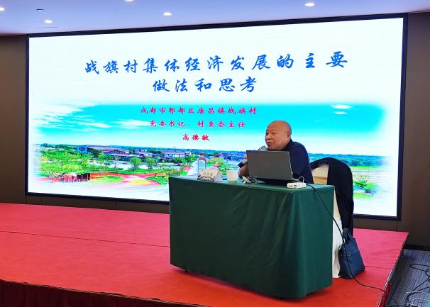 当日下午,四川成都市郫都区战旗村党委书记任高德敏以“战旗村集体经济发展的主要做法和思考”为题,为学员们带来了一场内容详实、启示深刻的讲座。高书记梳理了战旗村从人民公社时期至今的集体经济发展脉络,重点介绍了村集体在党建引领下,通过整合土地资源、盘活集体资产、推动产业融合,实现从传统农业村向三产融合城乡融合的先进村的发展历程。他还结合《农村集体经济组织法》的实施,分享了战旗村在明确组织属性、完善成员身份、规范议事决策等方面的实践感悟,并展望了未来在理顺组织关系、深化土地三权分置、搭建发展平台等方面的思考。高书记的讲解既有政策高度,又贴近基层实际,语言朴实、案例生动,引起学员广泛共鸣。