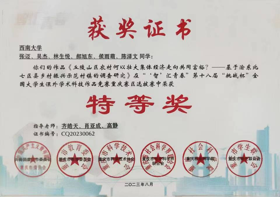 经济管理学院副教授、乡村振兴战略研究院兼职研究员齐皓天,经济管理学院教授、乡村振兴战略研究院执行院长肖亚成、经济管理学院教授、乡村振兴战略研究院兼职研究员高静共同指导的本科生团队作品《丘陵山区农村何以壮大集体经济走向共同富裕?——基于渝东北七区县乡村振兴示范村镇的调查研究》,在202363日参与第十八届“挑战杯”全国大学生课外学术科技作品竞赛重庆选拔赛决赛中获得特等奖,近日正式颁发了荣誉证书。该作品是三位指导老师以肖亚成教授2022年主持、大家共同参与的重庆市乡村振兴示范村镇中期评估项目所获取的调研资料为基础,指导由经济管理学院农林经济管理专业本科生与西塔学院经济学专业本科生组建的学生团队研究形成的,充分体现了科学研究、社会服务与人才培养的有机融合。